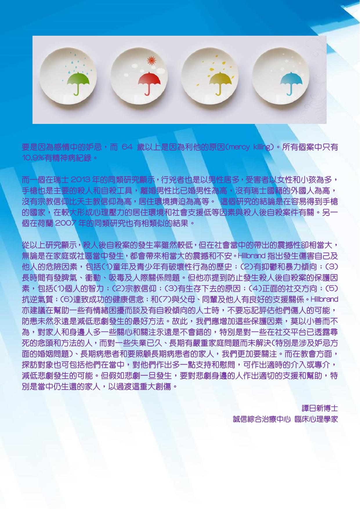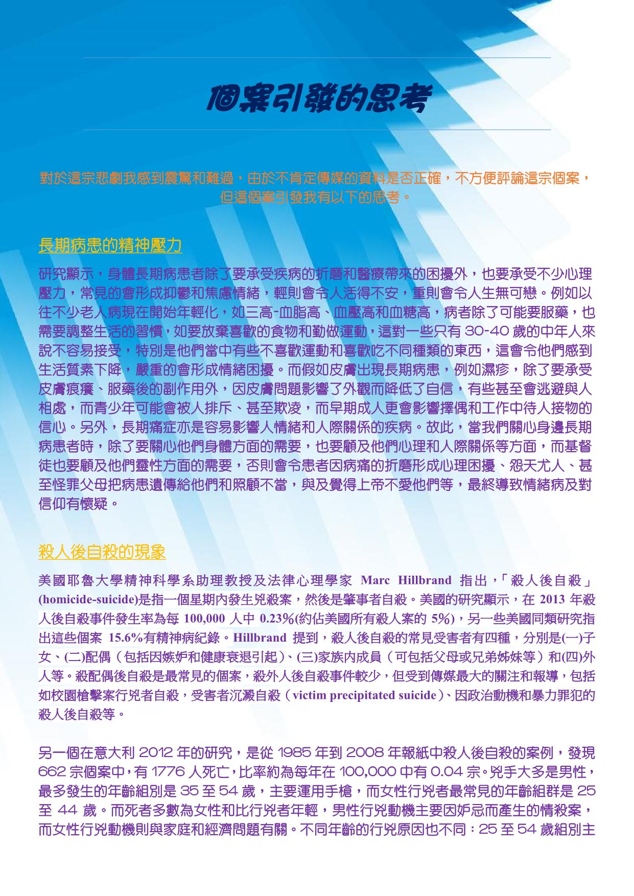 濕疹折磨23歲女弒父母父親節行兇後自盡 On 2018-07-132018-07-13 由tdwwhk撰寫In 放眼世界 屯門發生三屍倫常慘案,新屯門中心一個四口家庭原本相約親友在父親節聚餐,日前臨時變卦稱不能出席,其後失去聯絡,親友擔心發生事故昨上門探訪,揭發男女戶主胸口中刀、23歲細女膠袋笠頭並接駁一罐罐裝氣體,各自倒斃在房間內。警方在場撿獲一呎長染血兇刀,並在女兒房間撿獲遺書,透露不堪濕疹折磨而引發倫常慘劇,警方相信她前日父親節弒父母後自殺,將案列謀殺及自殺案跟進。 長期病患的精神壓力,會令他們感到生活質素下降,嚴重的會形成情緒困擾,……….想了解更多心理學家與你分享,請Click 入以下圖片。 分享此文: 按一下即可分享至 X(在新視窗中開啟) X 按一下以分享至 Facebook(在新視窗中開啟) Facebook 喜歡 正在載入... 相關