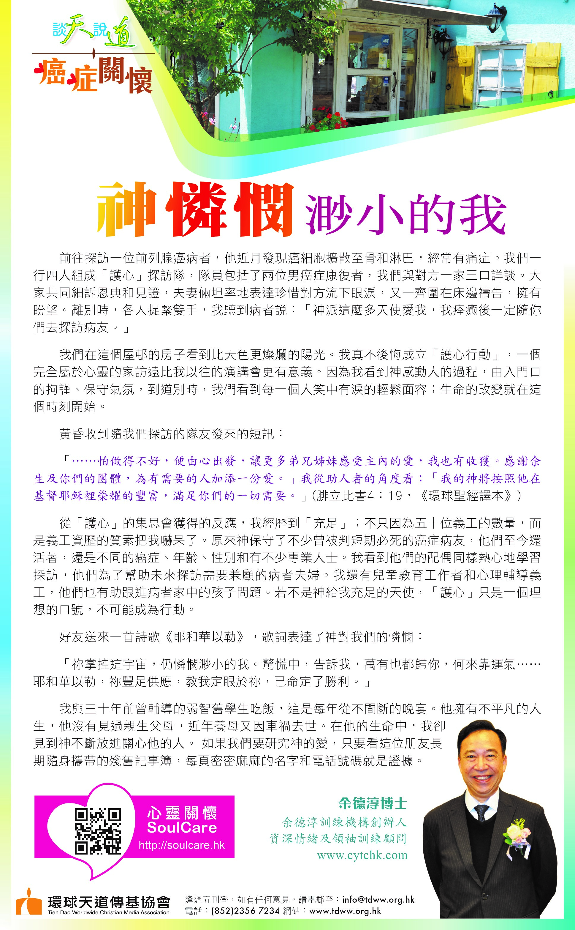 前往探訪一位前列腺癌病者,他近月發現癌細胞擴散至骨和淋巴,經常有痛症。我們一行四人組成「護心」探訪隊,隊員包括了兩位男癌症康復者,我們與對方一家三口詳談。大家共同細訴恩典和見證,夫妻倆坦率地表達珍惜對方流下眼淚,又一齊圍在床邊禱告,擁有盼望。離別時,各人捉緊雙手,我聽到病者說:「神派這麼多天使愛我,我痊癒後一定隨你們去探訪病友。」