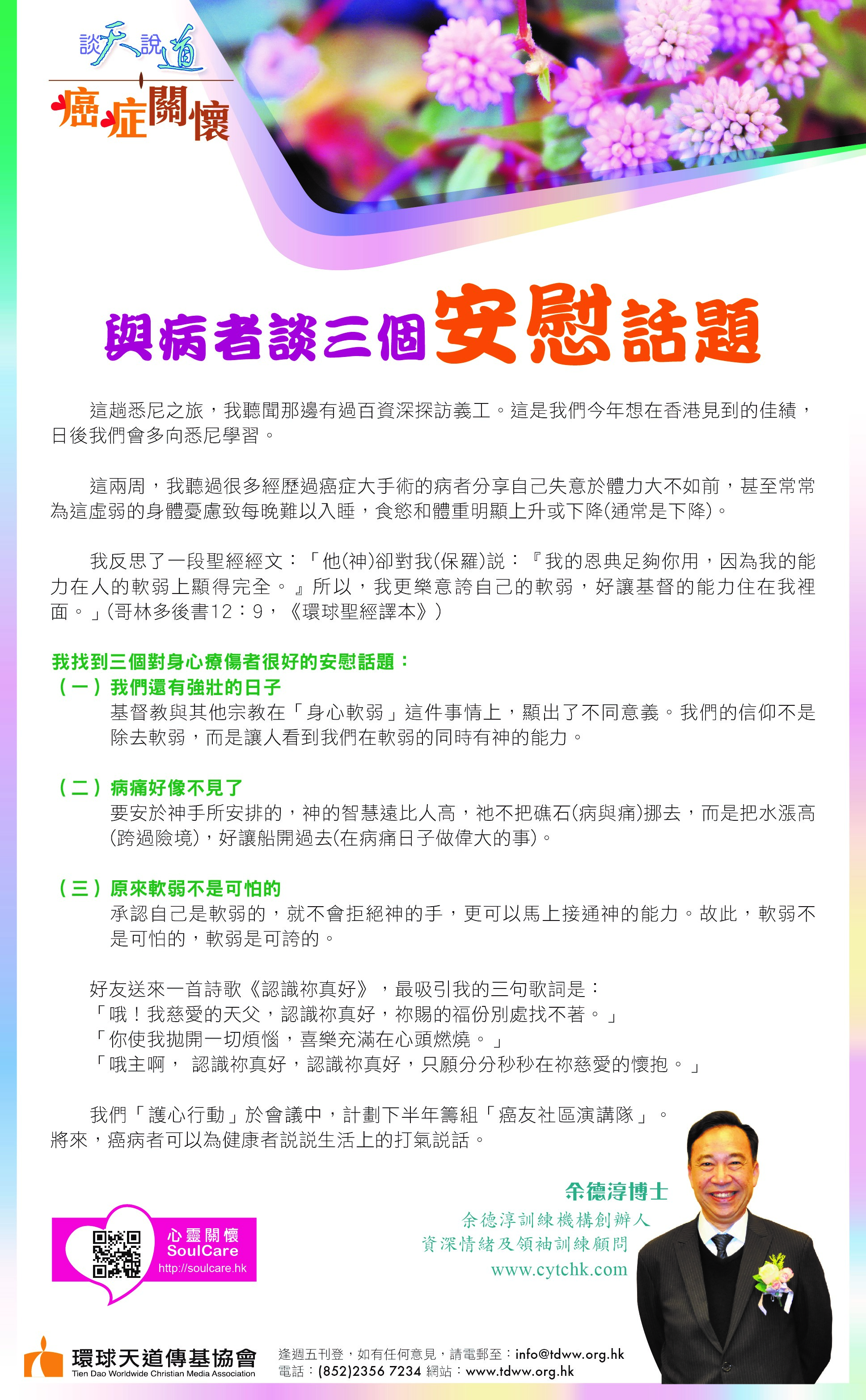 我很快收到這個家庭的回覆:「感謝安排探訪,我太太知道余博士能夠來探訪,也很感恩神的安排。我也很感動,沒想過;今天的探訪讓太太分享到她內心的感受,在那麼多人面前,她也願意踏出這一步。我們會每天祈禱……」