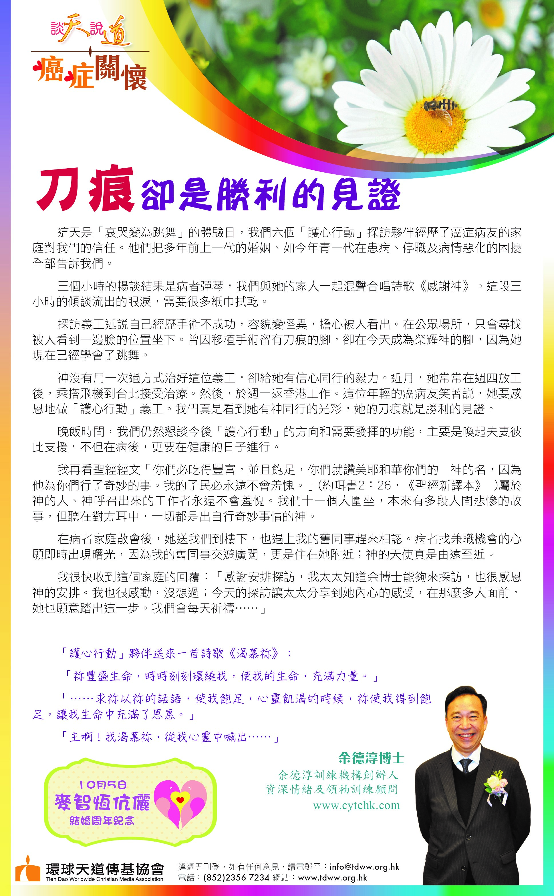 神沒有用一次過方式治好這位義工,卻給她有信心同行的毅力。近月,她常常在週四放工後,乘搭飛機到台北接受治療。然後,於週一返香港工作。這位年輕的癌病友笑著說,她要感恩地做「護心行動」義工。我們真是看到她有神同行的光彩,她的刀痕就是勝利的見證。