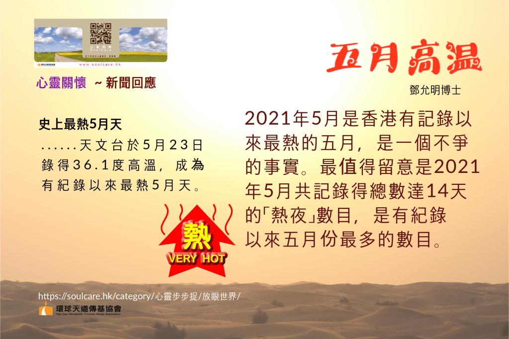 自1884年以來(除1940-1946年外),5月份首次出現熱夜的年份是在1932年,而1932年5月才錄得一次熱夜。其後,香港的5月零星地有些年份出現過不多於2個熱夜[除1991年5月有5個以外] 。但2005年以後,5月份有熱夜的年份明顯頻密。2012年之後,就幾乎每年都出現熱夜。2018年5月更首次出現6日熱夜。今年錄得14日熱夜的數目是超過過往最高記錄雙倍以外,實在令人驚訝!由今年5月16日起,出現了連續6個熱夜,亦刷新5月份最長連續熱夜的紀錄。