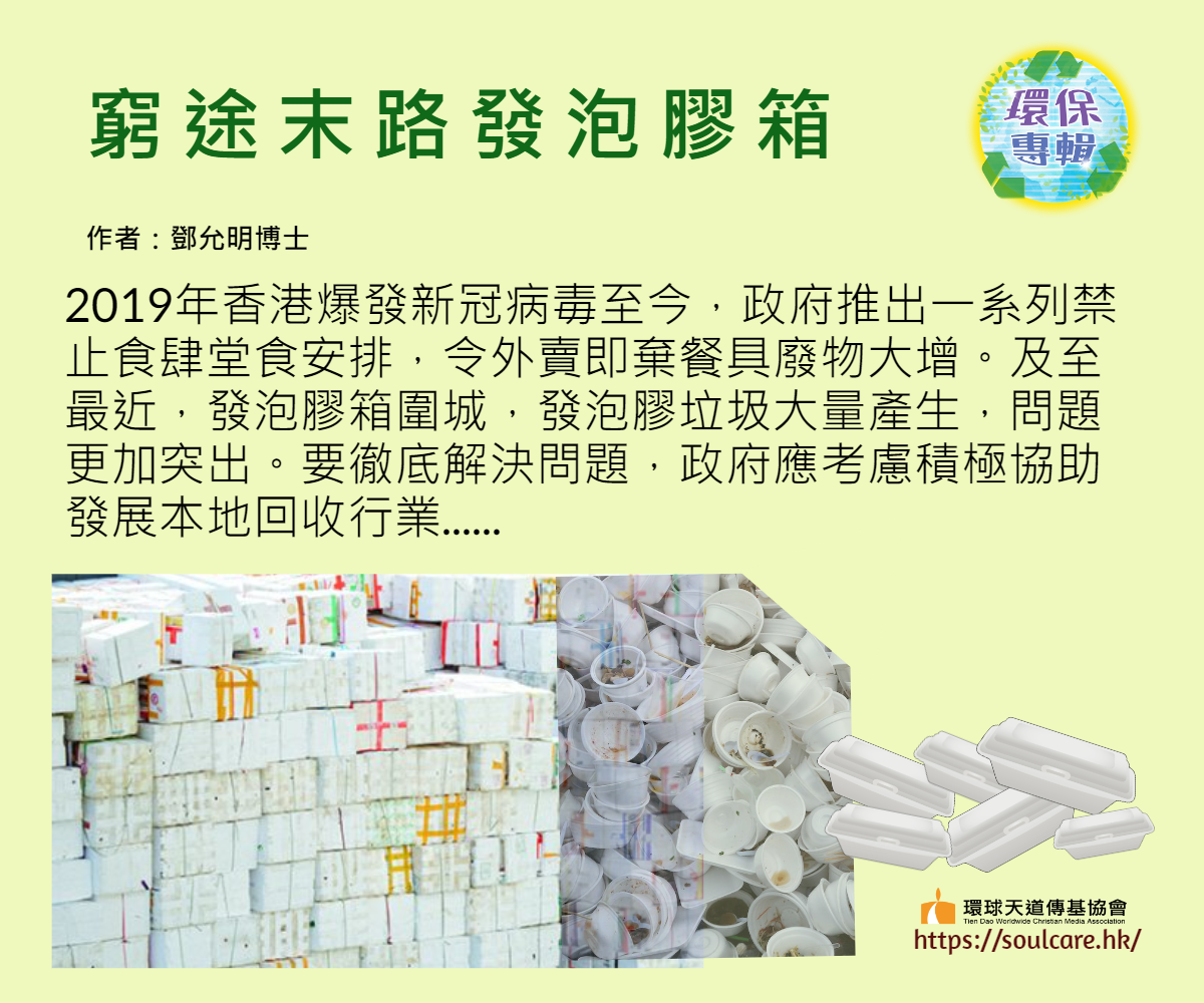 2019年香港爆發新冠病毒至今,政府推出一系列禁止食肆堂食安排,令外賣即棄餐具廢物大增。及至最近,發泡膠箱圍城,發泡膠垃圾大量產生,問題更加突出。要徹底解決問題,政府應考慮積極協助發展本地回收行業,例如:補貼回收商營運成本。務求達至本地廢料,本地處理,杜絕發泡膠箱圍城的困局。