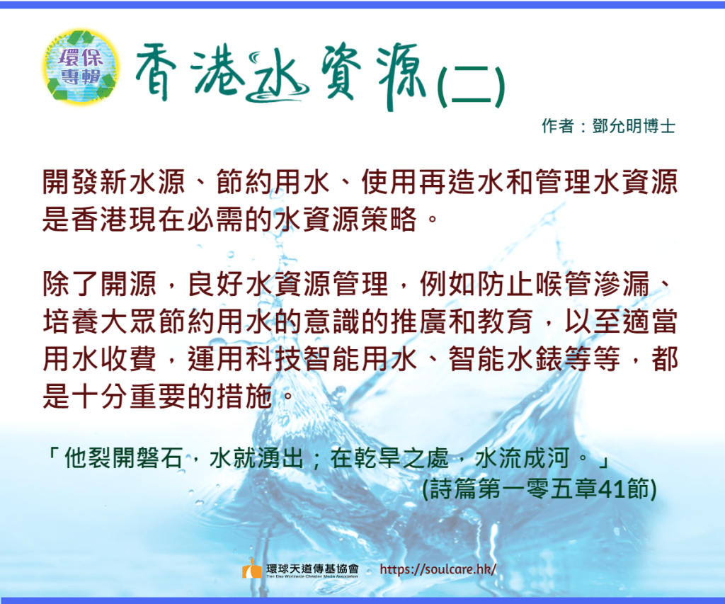 除了開源,良好水資源管理,例如防止喉管滲漏、培養大眾節約用水的意識的推廣和教育,以至適當用水收費,運用科技智能用水、智能水錶等等,都是十分重要的措施。制定並改革以充份反映真實成本的水費系統,改變大眾不良用水行為也是一個值得考慮的方向。另外,保護環境,確保水源不被污染,亦不能忽視。