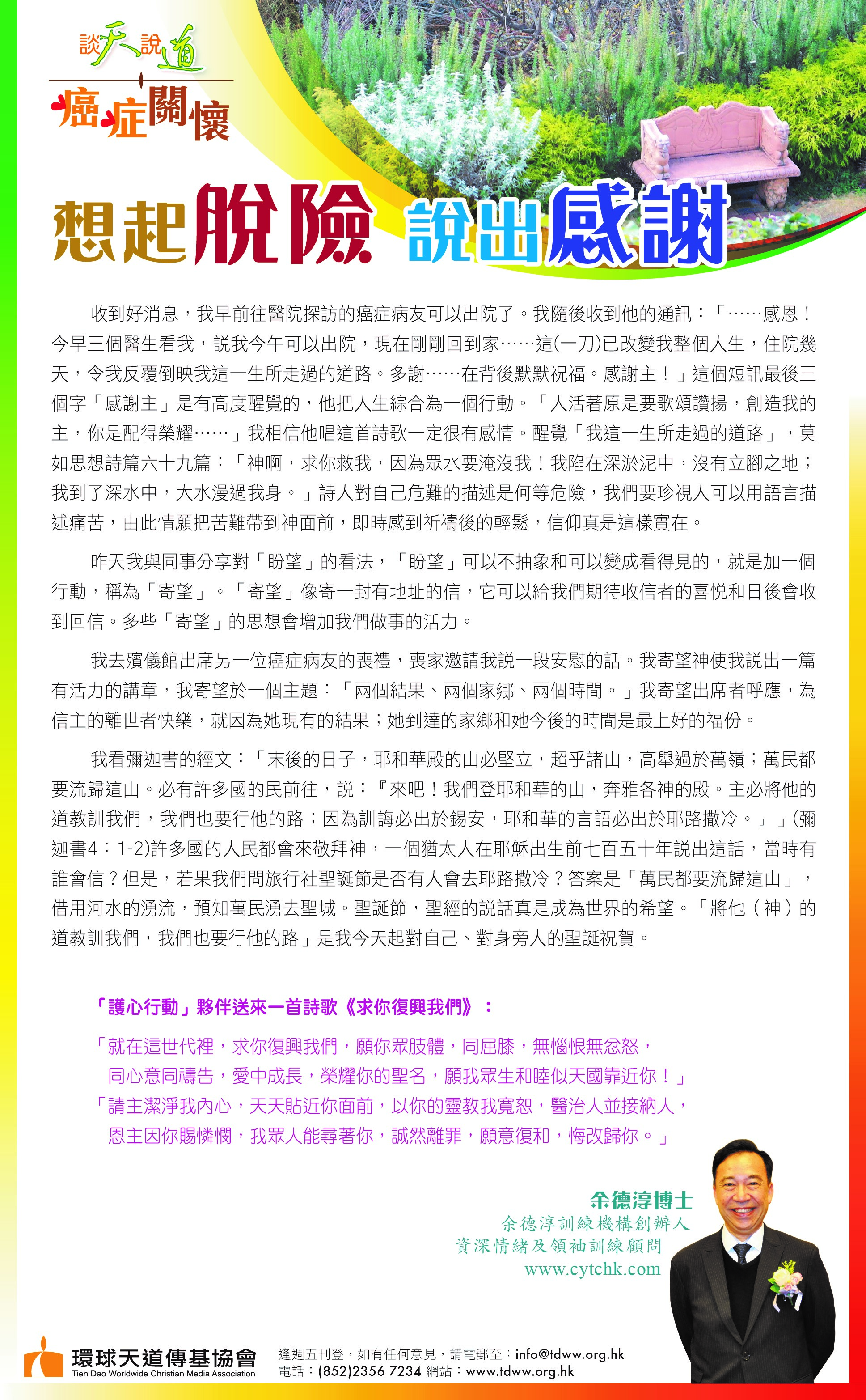 收到好消息,我早前往醫院探訪的癌症病友可以出院了。我隨後收到他的通訊:「……感恩!今早三個醫生看我,說我今午可以出院,現在剛剛回到家……這(一刀)已改變我整個人生,住院幾天,令我反覆倒映,我這一生所走過的道路。多謝……在背後默默祝福。感謝主!」這個短訊最後三個字「感謝主」是有高度醒覺的。他把人生綜合為一個行動:「人活著原是要歌頌讚揚,創造我的主,你是配得榮耀……」我相信他唱這首詩歌一定很有感情。醒覺「我這一生所走過的道路」,莫如思想詩篇六十九篇:「神啊,求你救我,因為眾水要淹沒我!我陷在深淤泥中,沒有立腳之地;我到了深水中,大水漫過我身。」詩人對自己危難的描述是何等危險,我們要珍視人可以用語言描述痛苦,由此情願把苦難帶到神面前,即時感到祈禱後的輕鬆,信仰真是這樣實在。
