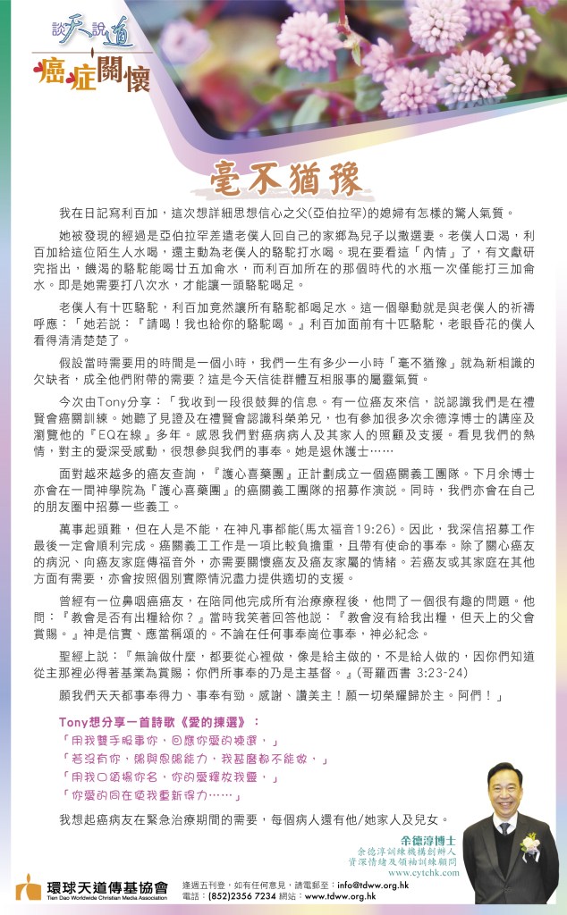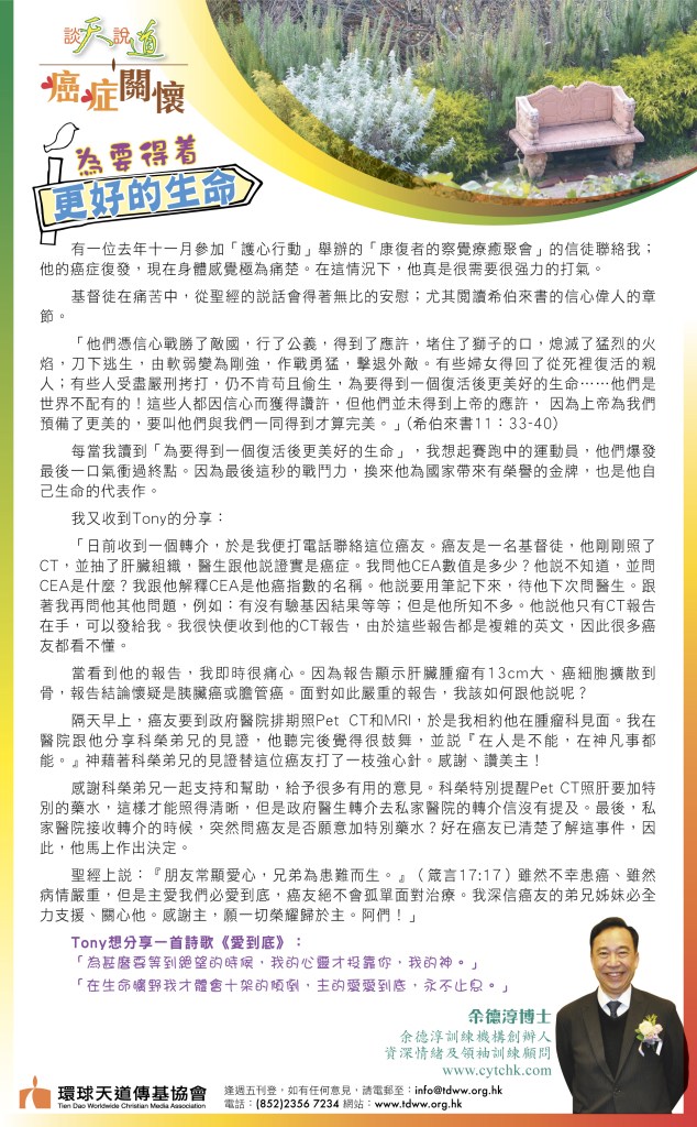 今次由Tony分享:「我收到一段很鼓舞的信息。有一位癌友來信,說認識我們是在禮賢會癌關訓練。她 聽了見證及在禮賢會認識科榮弟兄,也有參加很多次余德淳博士的講座及瀏覽他的『EQ在線』多年。感恩我們對癌病病人及其家人的照顧及支援。看見我們的熱情,對主的愛深受感動,很想參與我們的事奉。她是退休護士……