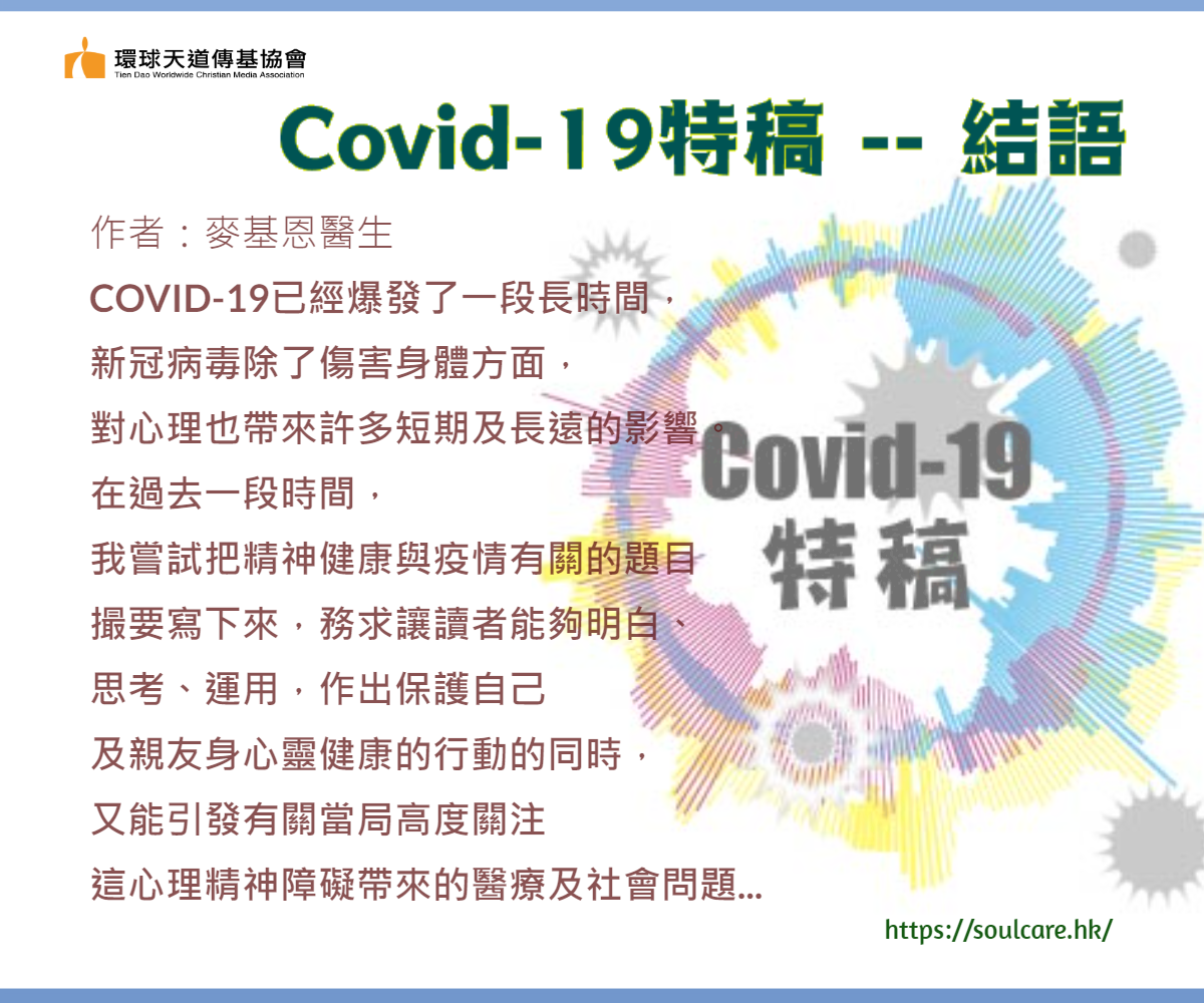 筆者衷心期望這些文章能夠起「拋磚引玉」之功用,讓聰明的讀者把正確的訊息傳開去的同時,亦能學以致用,在日常生活之中做一些對症下藥的事,把COVID-19疫情造成的精神及社會心理後遺症減至最低。
