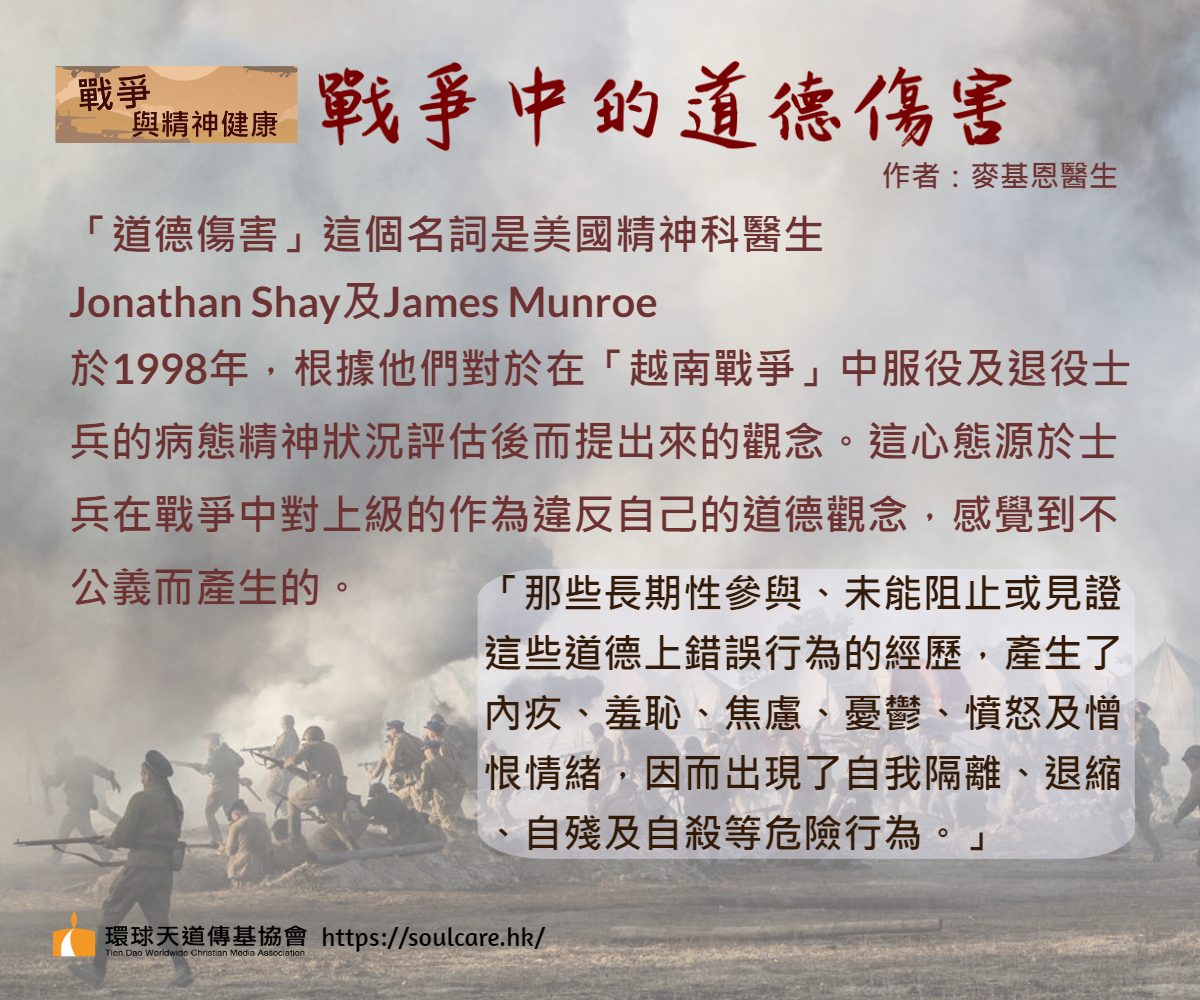 「道德傷害」(moral injury)這個名詞是美國精神科醫生Jonathan Shay及James Munroe於1998年,根據他們對於在「越南戰爭」中服役及退役士兵的病態精神狀況評估後而提出來的觀念。這心態源於士兵在戰爭中對上級的作為違反自己的道德觀念,感覺到不公義而產生的。例如在行動中,上級下令要對男女老幼村民格殺勿論,又或者上司獨斷獨行導致同僚喪生等。Shay指出,出現「道德傷害」包含了三種情況:有權力的人、在高風險的環境中、出賣道德上的正義。