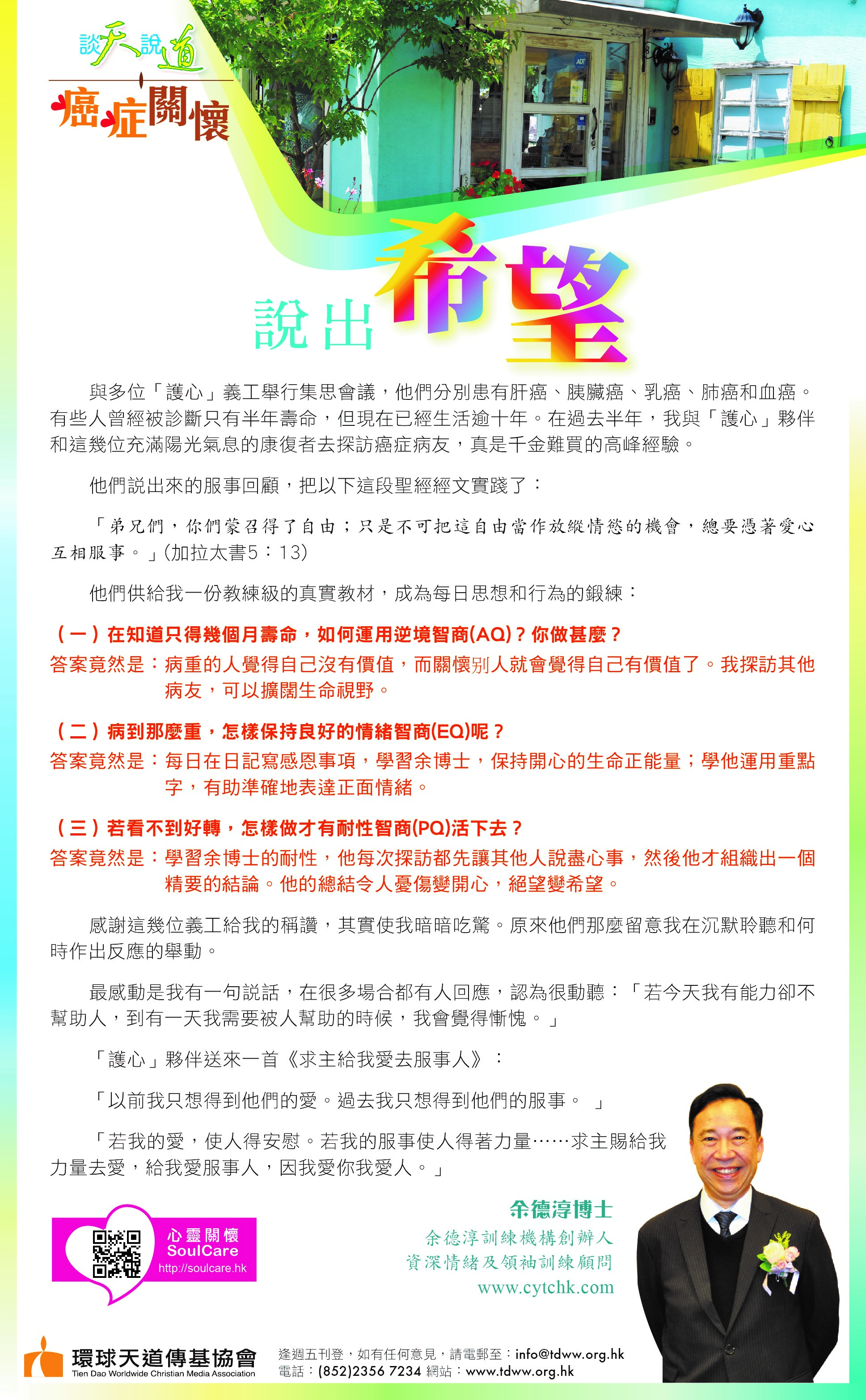 「你要把你的重擔卸給耶和華,他必扶持你;他永遠不會讓義人動搖。」(詩篇55:22) 我們在逆境的波浪中,神使我們不動搖。我希望讀者把這篇文章傳給患病和心中有憂愁的同事和朋友。